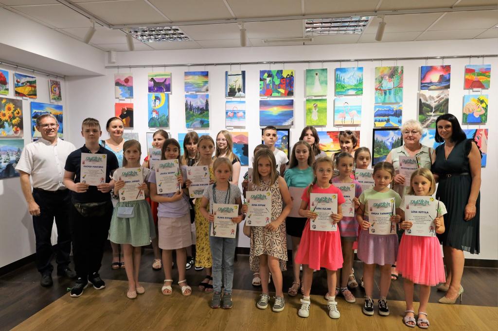 Nastepnie głos zabrał Piotr Kisała instruktor malarstwa, który od ponad 3 lat prowadzi zajęcia w naszym ośrodku kultury. Podziękował wszystkim uczestnikom za wytrwałość i systematyczność w uczęszczaniu na zajęcia oraz za ich zapał, zainteresowanie i chęć tworzenia niepowtarzalnych obrazów- prawdziwych dzieł stuki. Zaznaczył też, że wciąż jest duże zainteresowanie malarstwem wśród dzieci i młodzieży, a także, co bardzo cieszy, dostrzegalny jest rozwój artystyczny tych którzy uczęszczają na warsztaty najdłużej. Wspomniał również o aspekcie terapeutycznym zajęć. Malarstwo uspokaja, uczy skupienia, wrażliwości, obserwowania otaczającego nas świata, poczucia estetyki i piękna. Tego wieczoru zostały także wręczone wszystkim uczestnikom warsztatów malarskich pamiątkowe dyplomy oraz upominki. Na wystawie zaprezentowano ponad 100 prac, a była to tylko część wszystkich obrazów jakie powstały na zajęciach. Można było zobaczyć zarówno różnego rodzaju pejzaże, martwe natury, portrety ludzi i zwierząt, a nawet abstrakcje. Oprócz tego wszystkich zachwyciła szeroka paleta barw jaką zastosowali artyści do tworzenia swoich dzieł. Wystawa czynna będzie do połowy września 2023 roku. Zapraszamy wszystkich chętnych do zwiedzania wystawy w naszej „Galerii II Piętro” w godzinach pracy MGOK.