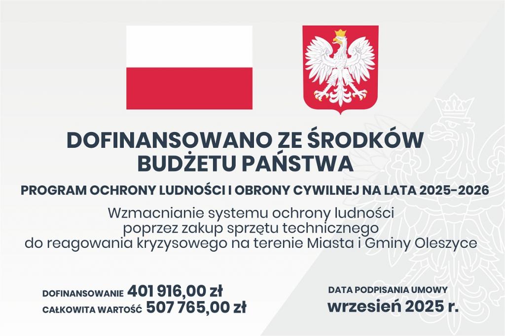 Tytuł projektu: „Wzmacnianie systemu ochrony ludności poprzez zakup sprzętu technicznego do reagowania kryzysowego na terenie Miasta i Gminy Oleszyce”