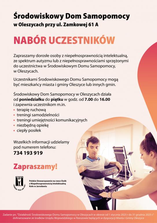 Obrazek Środowiskowy Dom Samopomocy w Oleszycach informuje, że dysponuje w placówce wolnymi miejscami. Środowiskowy Dom Samopomocy jest placówką wsparcia dziennego dla osób z niepełnosprawnościami. Jeśli w twojej rodzinie, otoczeniu jest osoba, która wymaga takiego wsparcia  - prosimy o przekazanie tej informacji. Więcej informacji na plakatach lub pod nr telefonu 734 193 919. więcej