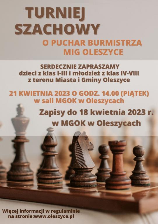 W dniu 21 kwietnia 2023 roku (piątek) o godz. 14.00 w Miejsko- Gminnym Ośrodku Kultury w Oleszycach, odbędzie się Turniej Szachowy o Puchar Burmistrza. więcej