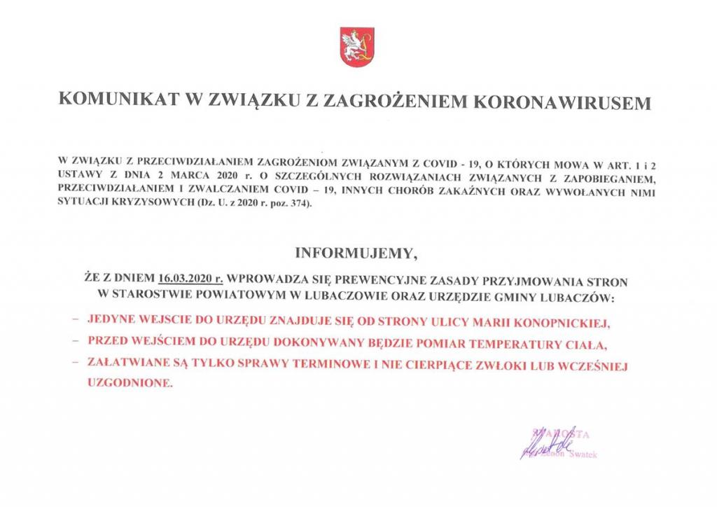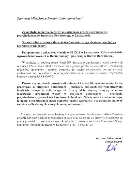 Ze względu na bezpieczeństwo mieszkańców proszę o ograniczenia przychodzenia do Starostwa Powiatowego w Lubaczowie.