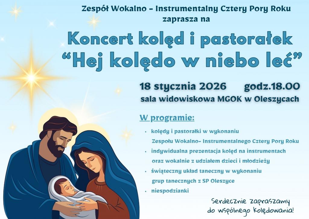 Obrazek Zespół Wokalno-Instrumentalny „Cztery Pory Roku” serdecznie zaprasza na koncert kolęd i pastorałek „Hej kolędo w niebo leć ”, który odbędzie się 18 stycznia 2026 roku (niedziela), o godz. 18:00 w Miejsko-Gminnym Ośrodku Kultury w Oleszycach.
