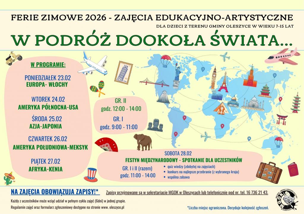 Obrazek Miejsko- Gminny Ośrodek Kultury w Oleszycach zaprasza na zajęcia edukacyjno-artystyczne dzieci i młodzież w wieku 7-15 lat pod hasłem „W podróż dookoła świata…”.