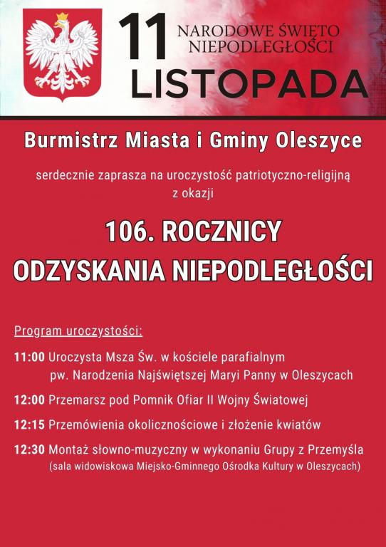 Obrazek Burmistrz Miasta i Gminy Oleszyce zaprasza do wzięcia udziału w obchodach Święta Niepodległości upamiętniającego 106. rocznicę Odzyskania Niepodległości przez Polskę, które odbędą się 11 listopada 2024 r.