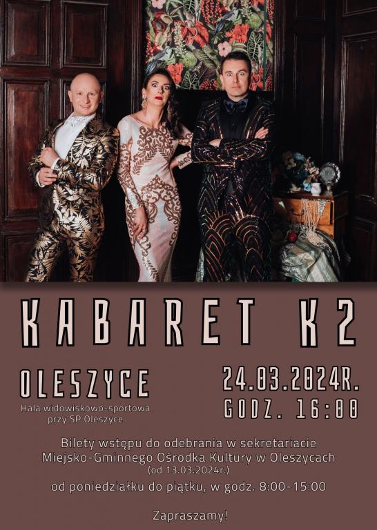 Serdecznie zapraszamy na występ kabaretowy w wykonaniu Kabaretu K2, który odbędzie się w niedzielę, 24 marca 2024r. o godz. 16:00, w hali widowiskowo-sportowej przy Szkole Podstawowej im. Jana Pawła II w Oleszycach.