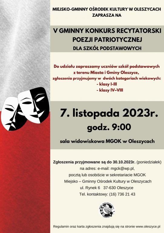 Obrazek Miejsko-Gminny Ośrodek Kultury w Oleszycach zaprasza uczniów szkół podstawowych z terenu gminy Oleszyce do wzięcia udziału w V Gminnym Konkursie Recytatorskim Poezji Patriotycznej dla Szkół Podstawowych, który odbędzie się 7 listopada 2023r. w sali widowiskowej.