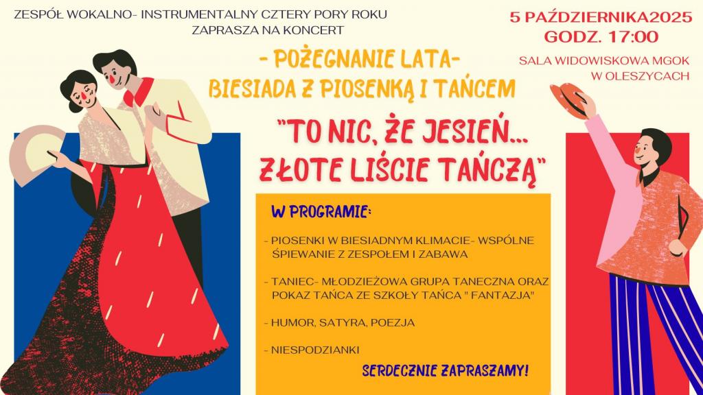 "To nic, że jesień... złote liście tańczą", który odbędzie się 5 października 2025 (niedziela) o godz. 17:00 w sali widowiskowej MGOK w Oleszycach. więcej