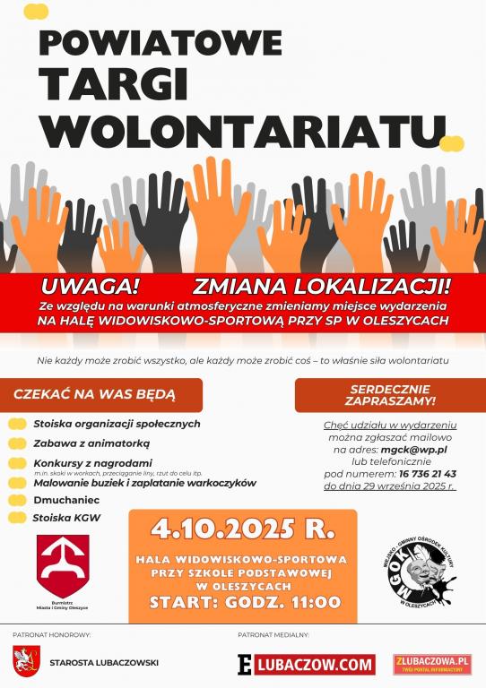 Serdecznie zapraszamy wszystkich mieszkańców powiatu – dzieci, młodzież, dorosłych, seniorów – na Powiatowe Targi Wolontariatu, które odbędą się 4 października 2025 roku w Hali widowiskowo-sportowej przy Szkole Podstawowej im. Jana Pawła II w Oleszycach