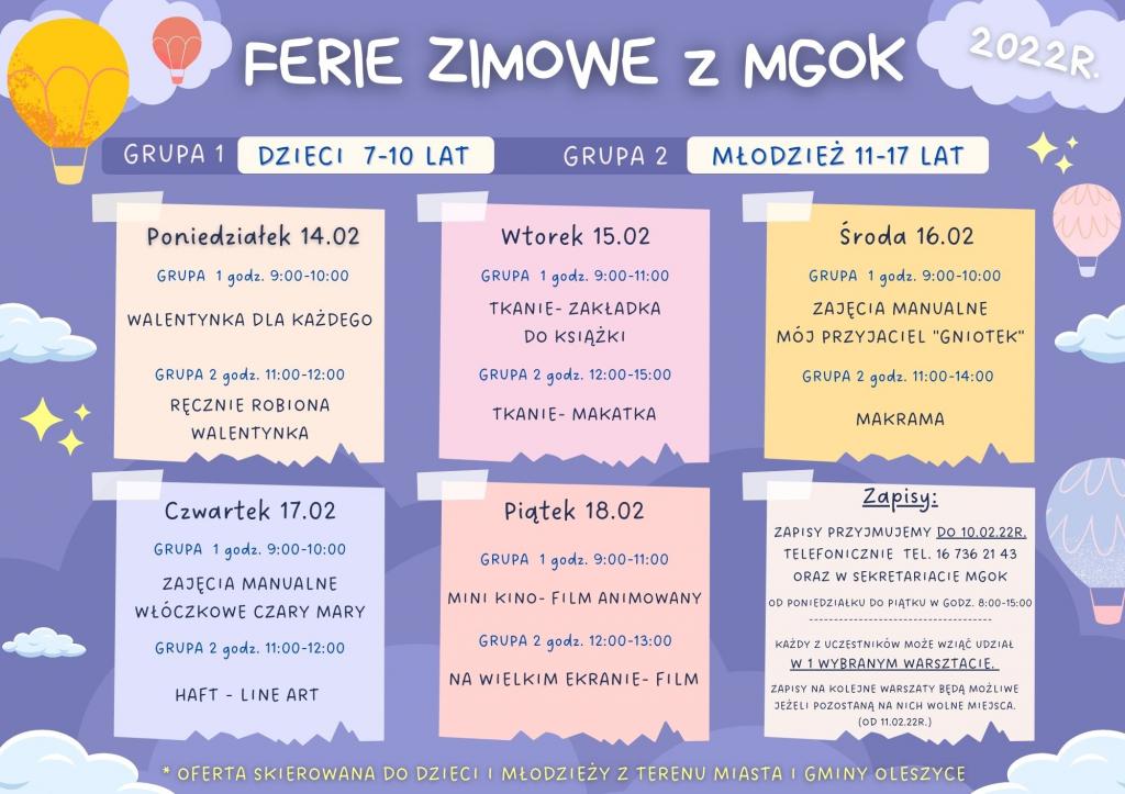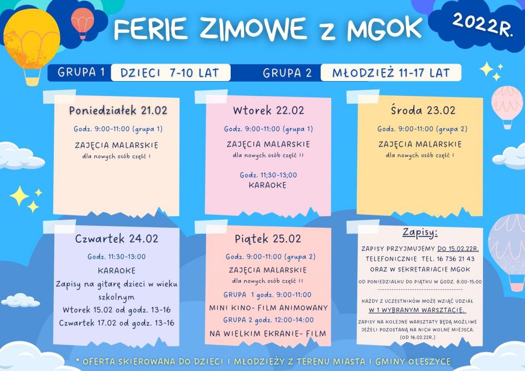 Obrazek Miejsko-Gminny Ośrodek Kultury w Oleszycach serdecznie zaprasza dzieci i młodzież z terenu miasta i gminy Oleszyce na zajęcia warsztatowe podczas ferii zimowych. Na wszystkie zajęcia obowiązują zapisy.