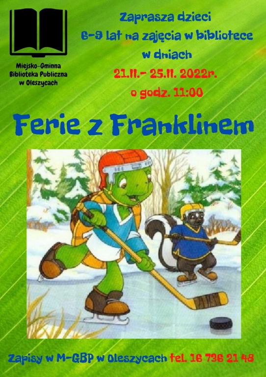 Miejsko- Gminna Biblioteka Publiczna w Oleszycach zaprasza w drugim tygodniu ferii chętne dzieci w wieku od 6 do 9 lat na zajęcia pod hasłem Ferie z Franklinem. W programie czytanie bajek, prace plastyczne i świetna zabawa.