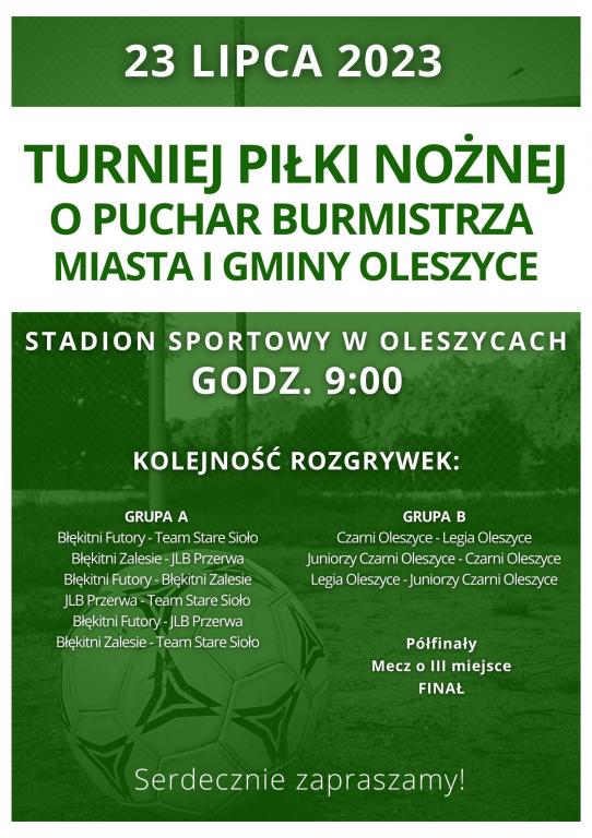 Obrazek Serdecznie zapraszamy  na Turniej Piłki Nożnej o Puchar Burmistrza Miasta i Gminy Oleszyce, który odbędzie się 23 lipca 2023r. na stadionie sportowym w Oleszycach. Rozpoczęcie o godz. 9:00.