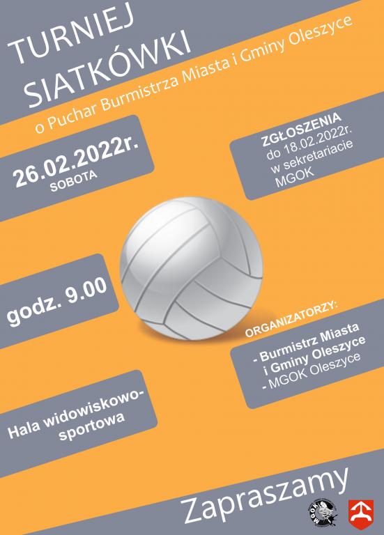Obrazek Serdecznie zapraszamy na Turniej Piłki Siatkowej o Puchar Burmistrza Miasta i Gminy Oleszyce, który odbędzie się 26.02.2022r. w hali widowiskowo-sportowej, przy SP w Oleszycach.
