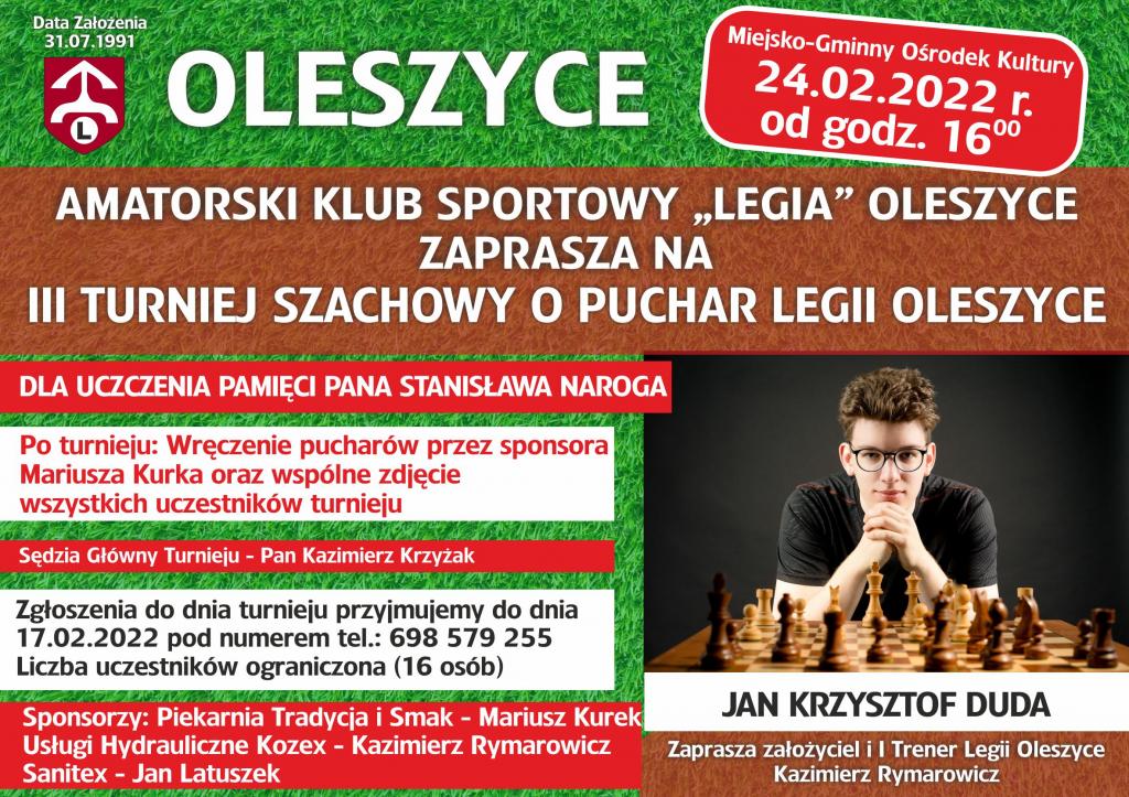 Obrazek Amatorski Klub Sportowy "Legia" Oleszyce serdecznie zaprasza na III Turniej Szachowy o Puchar Legii Oleszyce dla uczczenia pamięci Pana Stanisława Naroga, który odbędzie się 24 lutego 2022r. o godz. 16:00. Zapisy przyjmowane są telefonicznie do 17.02.