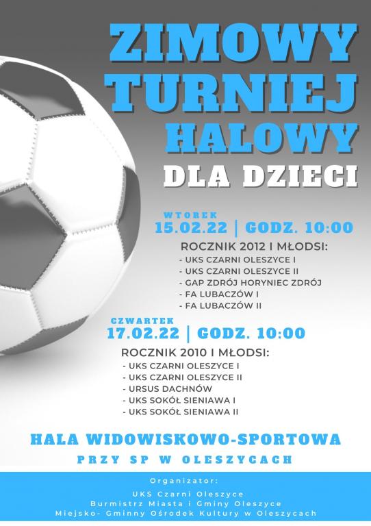 Obrazek Serdecznie zapraszamy na Zimowy Turniej Halowy dla dzieci, który odbędzie się 15 i 17 lutego w hali widowiskowo-sportowej przy Szkole Podstawowej w Oleszycach.