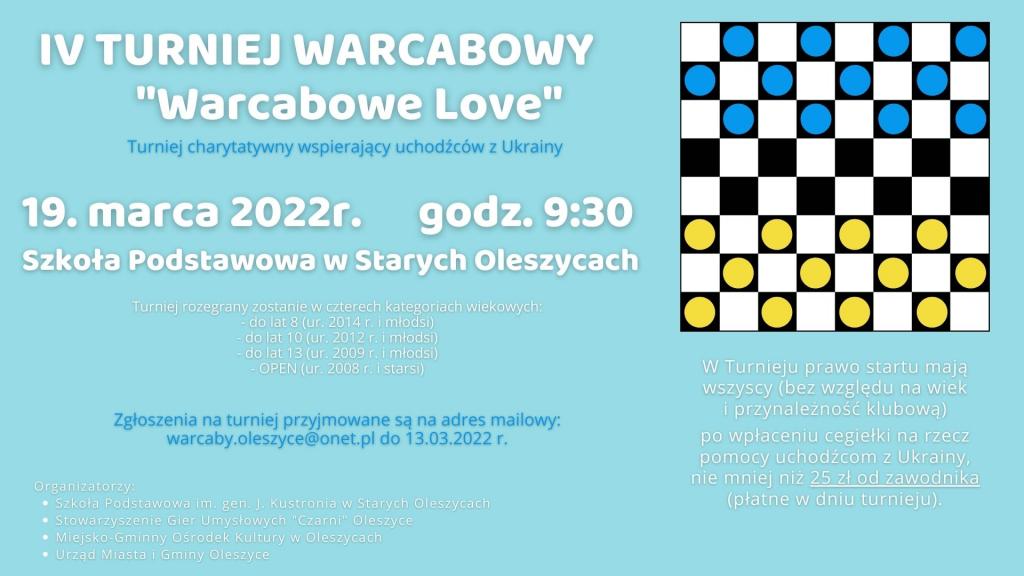 Obrazek  Stowarzyszenie Gier Umysłowych "Czarni" Oleszyce serdecznie zaprasza na turniej Warcabowe Love, który odbędzie się w sobotę, 19. marca w Szkole Podstawowej im. gen. J. Kustronia w Starych Oleszycach.