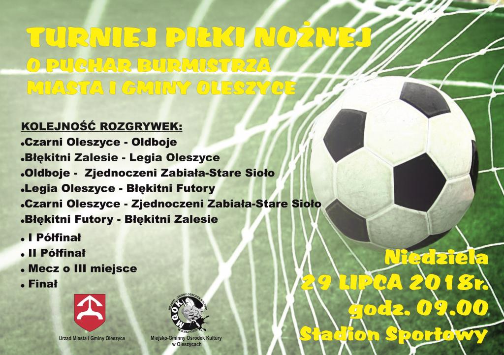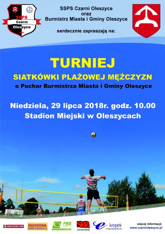 Burmistrz Miasta i Gminy Oleszyce oraz SSPS Czarni Oleszyce serdecznie zapraszają na Turniej Siatkówki Plażowej Mężczyzn o Puchar Burmistrza Miasta i Gminy Oleszyce, który odbędzie się w niedzielę, 29 lipca 2018r. na stadionie sportowym w Oleszycach.