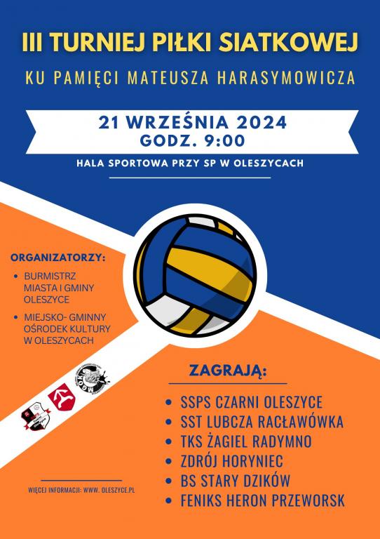 Obrazek Burmistrz Miasta i Gminy Oleszyce, Miejsko-Gminny Ośrodek Kultury w Oleszycach oraz SSPS Czarni zapraszają na III Turniej Piłki Siatkowej ku Pamięci Mateusza Harasymowicza, który odbędzie się 21 września 2024r. w hali sportowej przy Szkole Podstawowej w Oleszycach. Rozgrywki rozpoczną się o godz. 9:00.