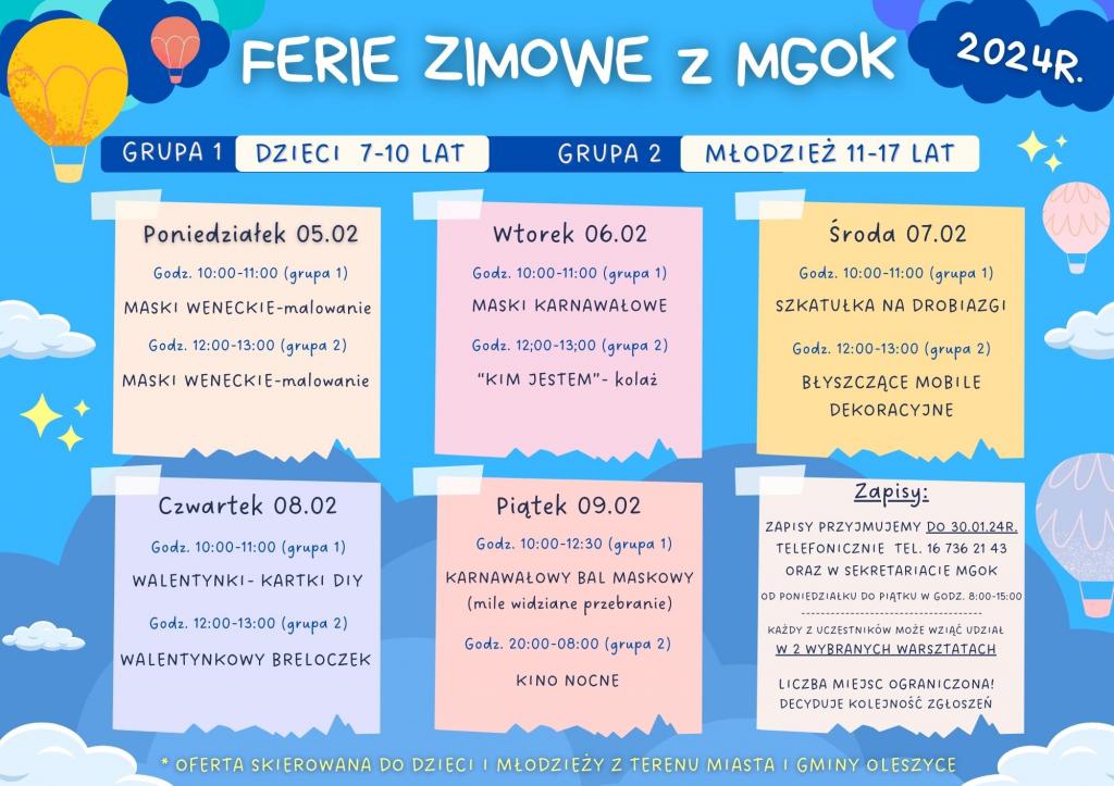 Zapisy przyjmujemy do 30.01.24r. telefonicznie tel. 16 736 21 43 oraz w sekretariacie MGOK, od poniedziałku do piątku w godz. 8:00-15:00.