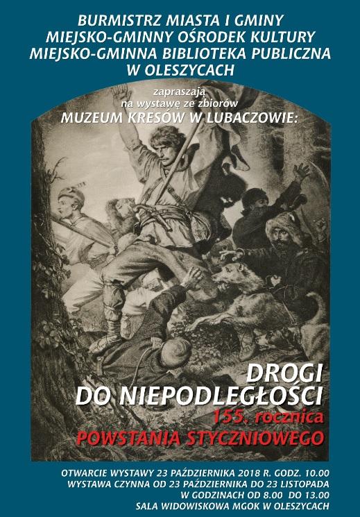 Burmistrz Miasta i Gminy Oleszyce, Miejsko-Gminna Biblioteka Publiczna w Oleszycach i Miejsko-Gminny Ośrodek Kultury w Oleszycach serdecznie zapraszają na wernisaż wystawy "DROGI DO NIEPODLEGŁOŚCI" 155. ROCZNICA POWSTANIA STYCZNIOWEGO.